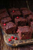 Brownie kawałki z orzechami ozdobione jagody i liście mięty na białym papierze.