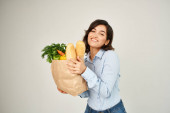 Piękna młoda kobieta trzymając papierową torbę z bakalii i zabawy.