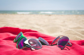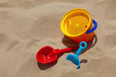Dla dzieci plaży zabawki - wiadra i łopata na piasku. Słoneczny dzień