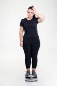 Beautiful wondered young fitness woman standing on weighing scale