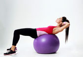 Wesoły ładny fitness kobieta siedzi na różowy fitball