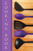naczynia kuchenne na drewniane tła i książka kucharska