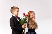 dziewczyna i chłopak powitanie kwiaty na białym tle nad białym