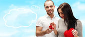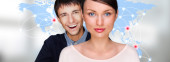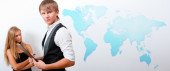Serwis przyjazny para futurystyczny interfejs stoi przed świata mapa świecące gorących punktów lokalizacji i połączenia linii