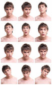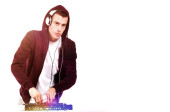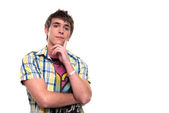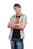 młody człowiek słuchania muzyki z słuchawki, stojąc na niebieskim tle