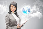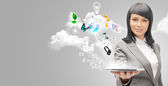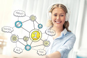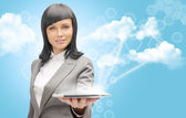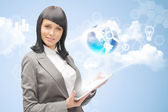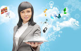 portret wesoły biznes kobieta siedzi na jej biurku gospodarstwa w symbolu