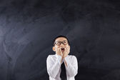piękne Europejskiego młodych stałe kobieta siedzi w okularach na szarym tle