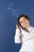 znudzony biznesmeni: kobieta siedzi przy biurku z zamknięte oczy. młody biznes kaukaski kobieta w jej biurze