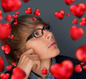obraz młody człowiek myśli o swoich planach o Walentynki i jego para