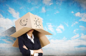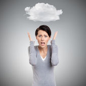 portret młodej kobiety w otoczeniu wiele pól. wiele koncepcji pracy. potrzebna pomoc. pusty obłok balony nad głową
