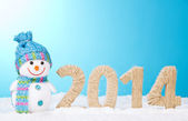 Signpost of the New Year and two Snowman with red sled stand near direction sign. Happy new year postcard