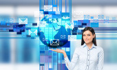 portret młodej kobiety stoi przed wielkim świecie mapy i różne ikony latające nad głową