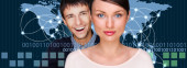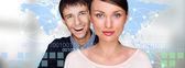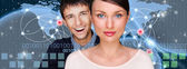 portret młoda para Ogarnięcie i gospodarstwa czerwone serce. stojąc przed mapa świata