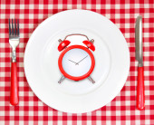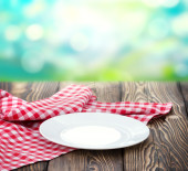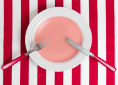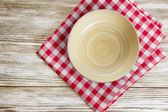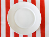 Białe puste czyste płyty na tle czerwony obrus z dishwa