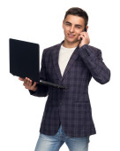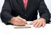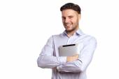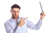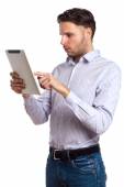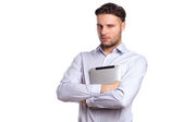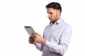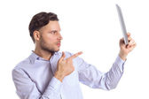 Zamyślony młody biznesmen trzymając Tablet i pióro