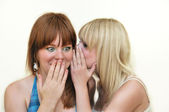 społeczeństwo plotek - dwa szczęśliwy młode dziewczyny mówiąc biały backg