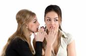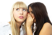 społeczeństwo plotek - dwa szczęśliwy młode dziewczyny mówiąc biały backg