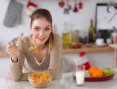 Uśmiechający się młoda kobieta, picie mleka, stojąc w kuchni