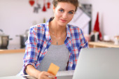 uśmiechnięta młoda kobieta z filiżanki kawy i laptopa w kuchni w domu