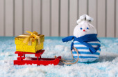 United States new year concept. Signpost with word USA and Snowman With gift, red sled stand near direction sign. Christmas And New Year postcard