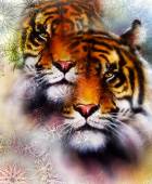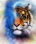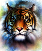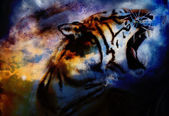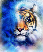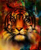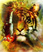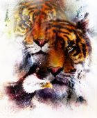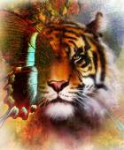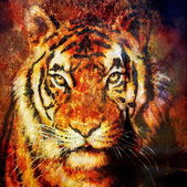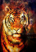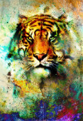 Painting sunset, sea and tree, and tiger portrait, wallpaper landscape, color collage. and abstract grunge background with spots.