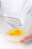 metalowa Trzepaczka do ubijania jajek i brązowe jaja na białym tle