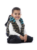 Zabawne dziecko. modny chłopczyk w dżinsy, czarna koszula, działkach pasiasty tłumik i i wyściełane kamizelka .stylish uśmiechnięte dziecko. moda dzieci