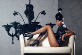 atrakcyjna kobieta usytuowanie w białym fotelu na koła tło