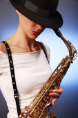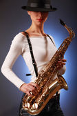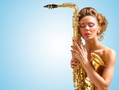 Seksowny atrakcyjny kobieta w krótkich spodenkach z saksofon