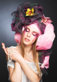 zmysłowy piękne sexy kobieta w zielony strój i kapelusz kwiat