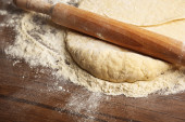 Ciasto na pizzę i wałek na drewnianym stole
