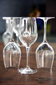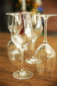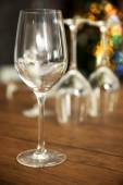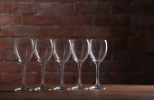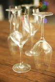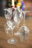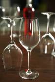 Budowy puste kieliszki i butelkę na drewnianym stole przeciwko tło zamazane pole