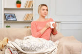 Młoda kobieta uśmiechający się oglądanie Tv na kanapie.