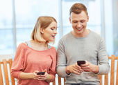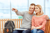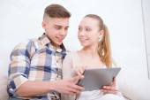 Młody uśmiechający się para przy użyciu komputera typu tablet.