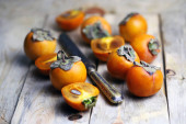 Świeżych dojrzałych persimmon na drewnianym stole - selektywne focus