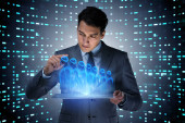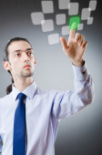 Biznesmen wciskający wirtualne przyciski