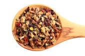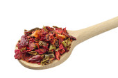 Mieszanki suche papryki w drewnianą łyżką na białym tle