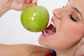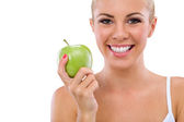 uśmiechający się zdrowy dziewczyna z zielonym jabłkiem