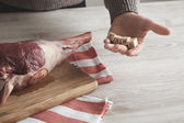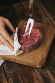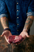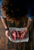 Widok z góry dwie ręce wytatuowany i trzy steki na stole