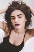 piękna brunetka dziewczyna w beżowy sweter, dżinsy, fryzura
