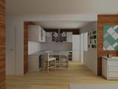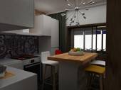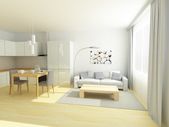 Studio flat kuchnia i pokój dzienny w jasnych kolorach szary i biały. Styl skandynawski.