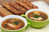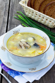 Zupa rybna ucha łososia czerwona ryba na tle drewniane