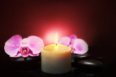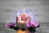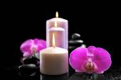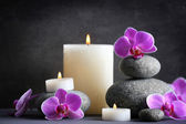 Spa kompozycja z świece, kamienie i kwiaty na stole, z bliska
