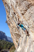 Zespół wspinaczy mężczyzna i kobieta rosnącej pomarańczowy jasny skalną ścianą z liny i narzędzi