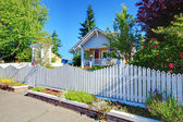 ładny dom szary na zewnątrz patio i małe ogrodzenie