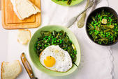 kraju śniadanie z ziemniaków z boczkiem i jajka sadzone na patelni surówki.