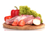 Surowe mięso i warzywa na deska na białym tle na Zielone Świątki?
