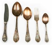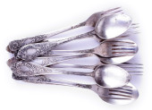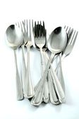 srebrne łyżki, widelce i noże na białym tle nad białym