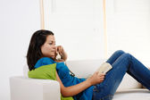 dziewczyna, czytanie książki, jej łokieć spoczywa na odwrocie th