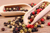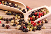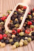 Świeży pieprz kolorowe z łyżką na drewniane tła